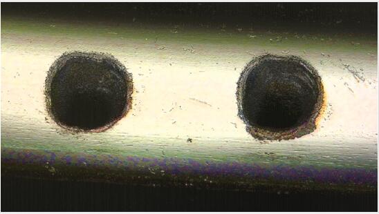 圖3:在100微米的鈷鉻(CoCr)線纜上的這些盲孔顯示,飛秒激光器可以消融表面,并且不會出現微裂紋