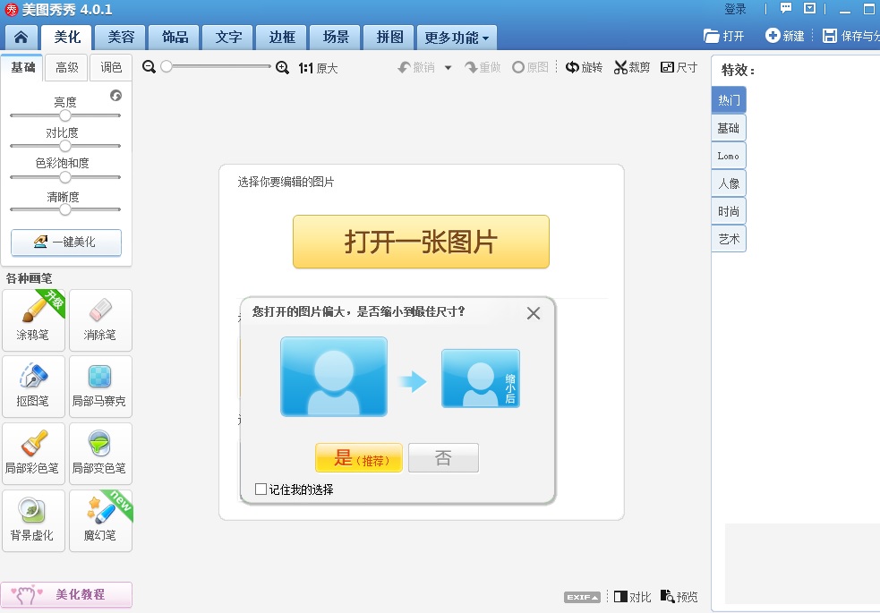 3、打開美圖秀秀,點擊美化照片,點擊打開一張圖片,找到指定的圖片,點擊打開,點擊是(打開到合適的大小),進入編輯照片這里。