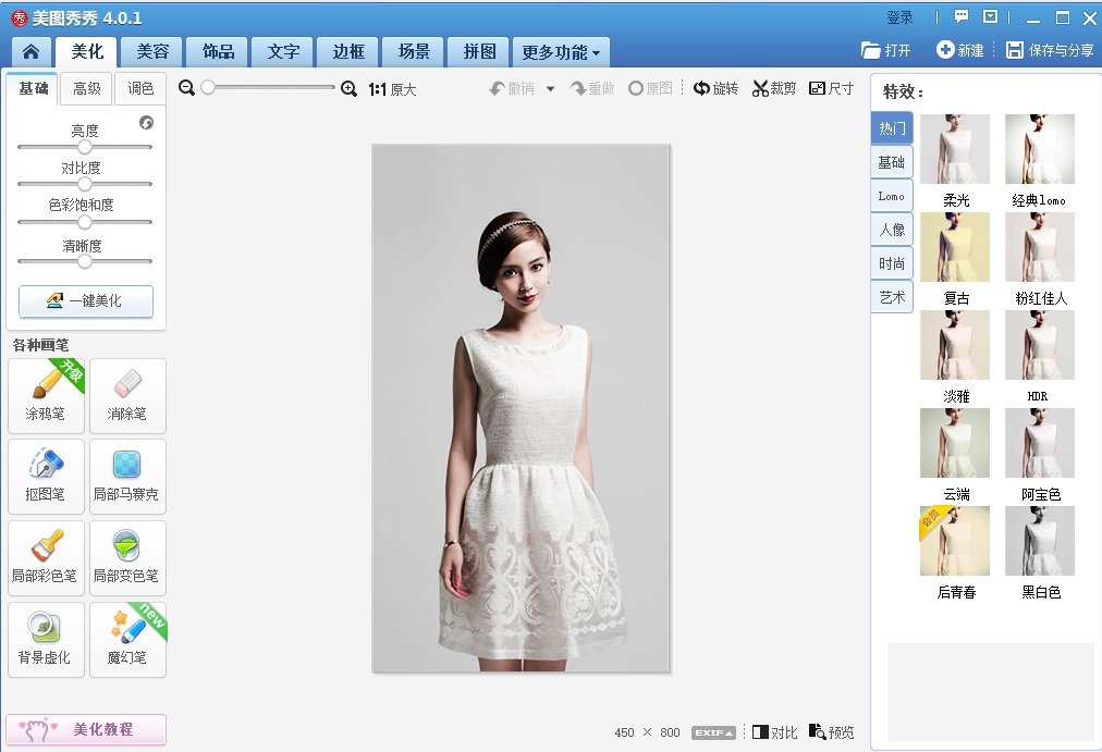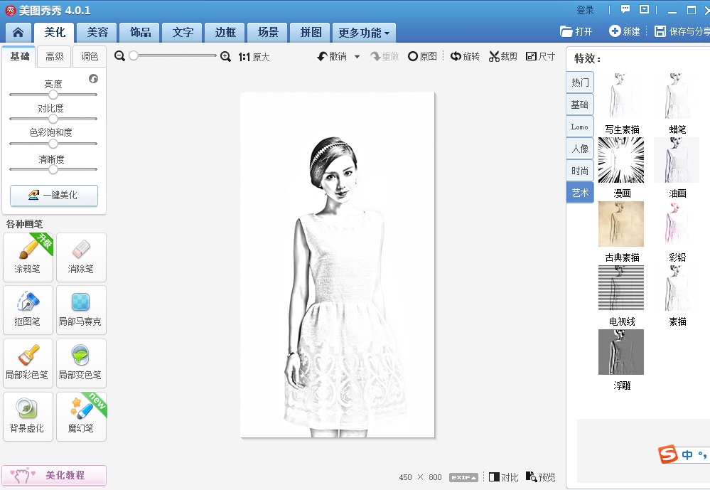 4、點擊右側(cè)特效下面的藝術(shù),點擊素描(變成黑白照片了),調(diào)整合適的比例,如果對比度不夠的話,可以調(diào)節(jié)左上角的對比度、亮度、色彩飽和度、清晰度這些調(diào)節(jié)條。