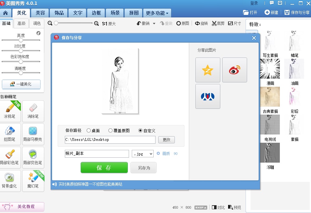 5、點擊右上角的保存與分享,命名一個文件,然后保存相關(guān)照片或者另存為另外一個文件名的照片,建議另存為,這樣文件與原照片有區(qū)分。