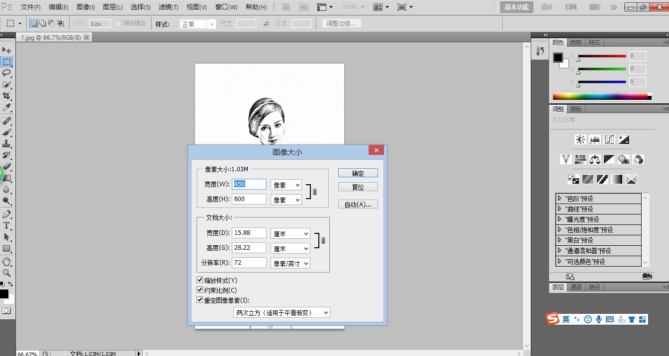 7、點擊菜單欄圖像—圖像大小—文檔大小,輸入要打標的照片的高度和寬度(注意單位是厘米),點擊確定。