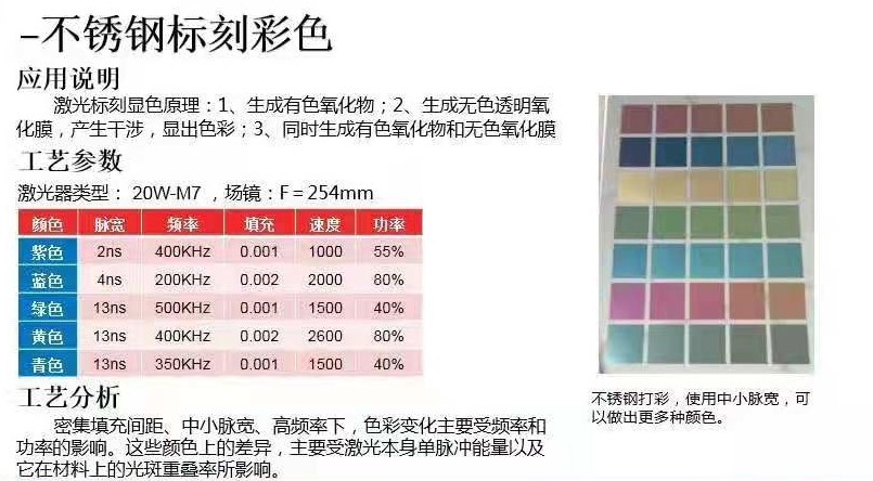 ? ? 工藝分析:在密集填充間距、中等脈寬、高頻為前提,色彩變化是由頻率及功率所帶來的作用。換句話說,這些顏色上的差異,主要受激光本身單脈沖能量以及它在鋼片上的光斑重疊率所影響。