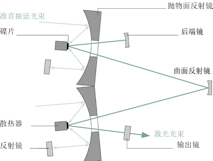 另外一種方法是將多個(gè)腔耦合起來,那么所有碟片的功率會(huì)被耦合成一個(gè)激光束。這些單個(gè)腔不是像光纖激光器那樣并行耦合的,而是串成一排,一個(gè)挨著一個(gè),通過一個(gè)諧振腔在光學(xué)上連接起來。這個(gè)方法可以獲得高光束質(zhì)量。