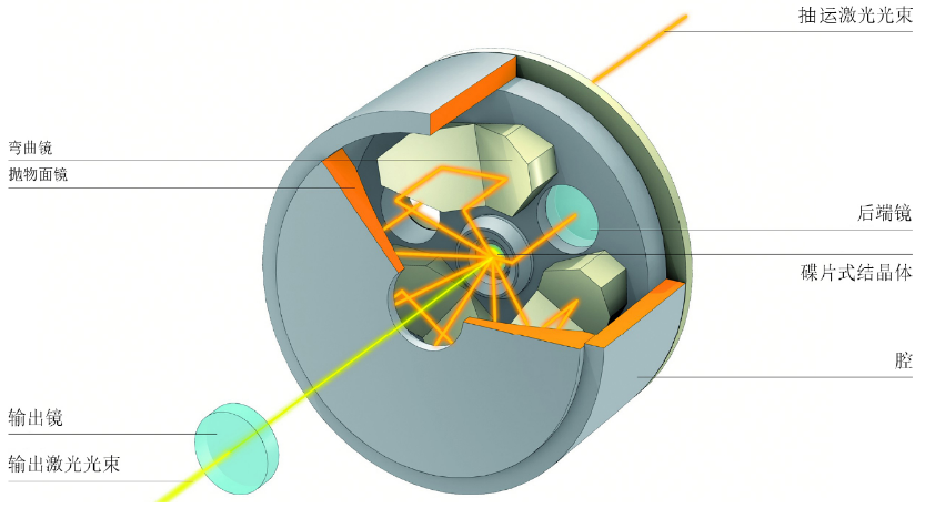 碟片激光器的激光增益核心是很小的超薄摻鐿釔鋁石榴石制成的碟片晶體。它的直徑略小于15 mm,厚度只有0.05 mm。碟片放置在能夠散熱、冷卻碟片的熱沉上。冷卻的碟片后端有一個(gè)反射面,可以反射激光和抽運(yùn)光。